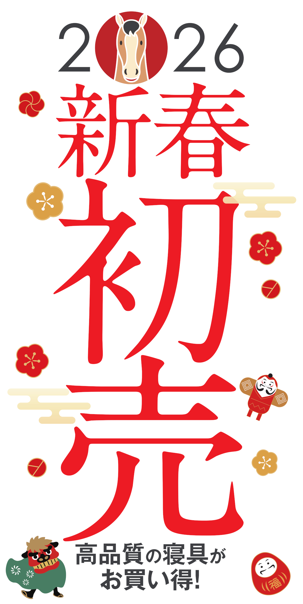 セール 明日(1/4)からの新春初売りチラシを掲載しました 2026年1月3日 明日(1/4)からの新春初売りチラシをホームページに掲載いたしました。 セール期間は1/4~1/26まで。 ※オンラインショップをご利用の場合は「お年玉20%OFFクーポンコード」がご使用いただけます。詳しくはこちら お店の開店時間はAM10:00です。 お買い得品が満載ですのでお見逃しなく! チラシの内容はこちらからご覧いただけます(^^♪