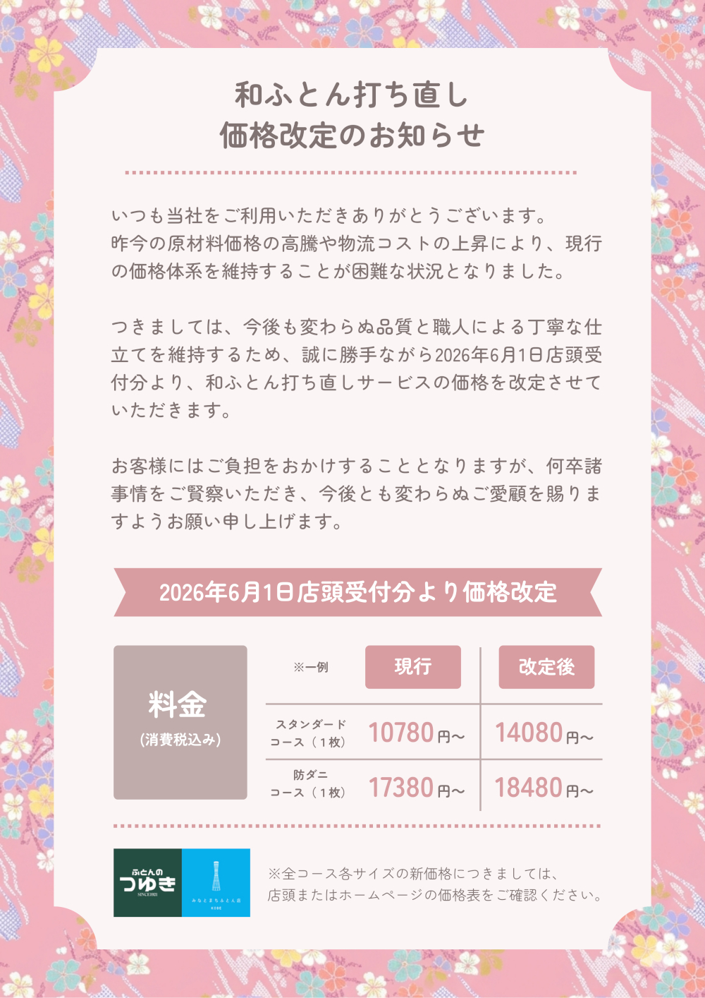 (料金には ①打ち直し代 ②新しい側生地代 ③足し綿(わた)代が含まれています)